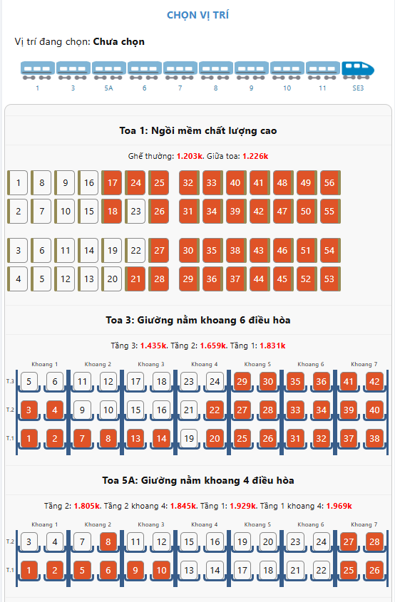Nằm khoang 6 (Giường tầng 1) | BnT1 | 280.000 VNĐ | 330.000 VNĐ |