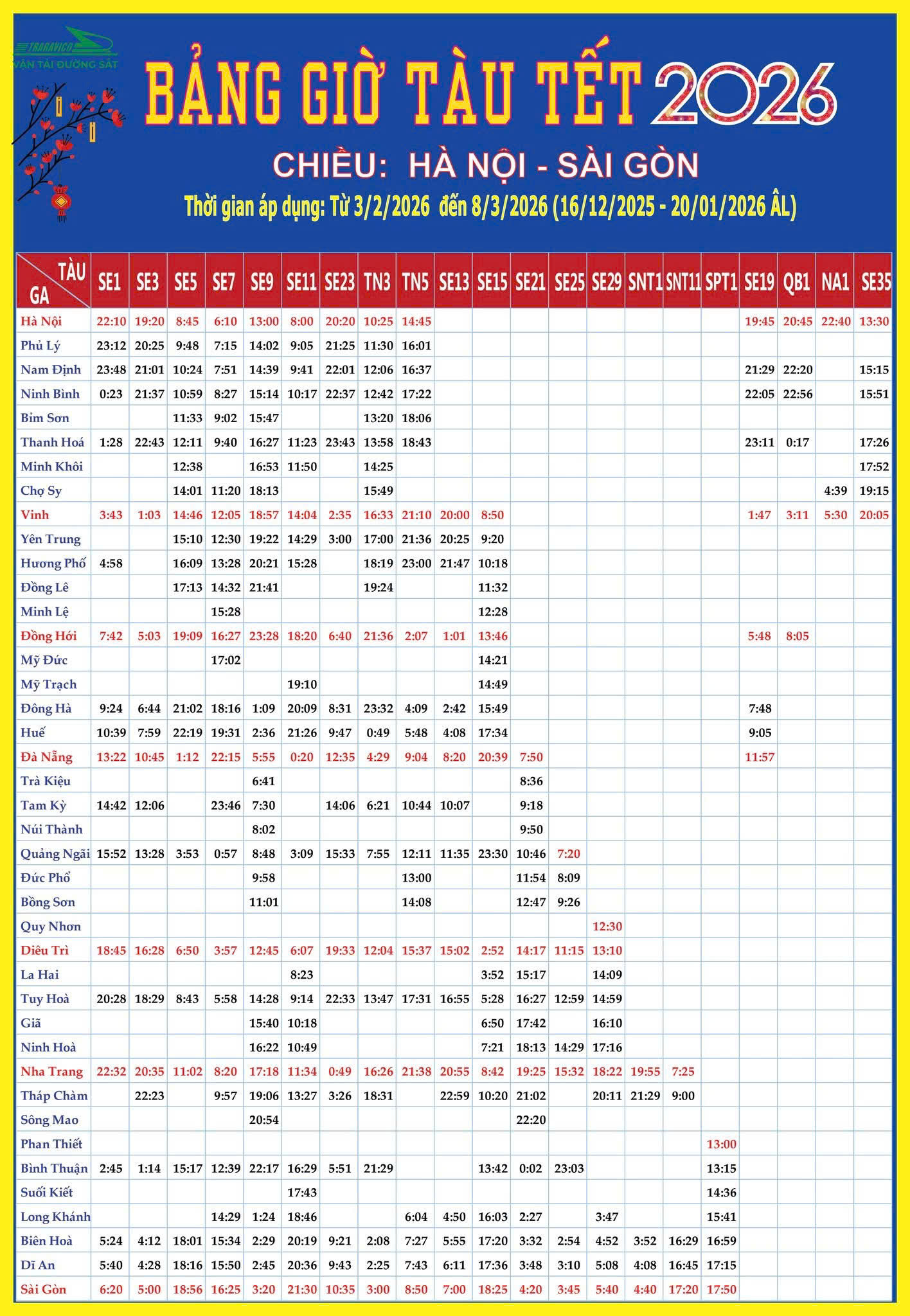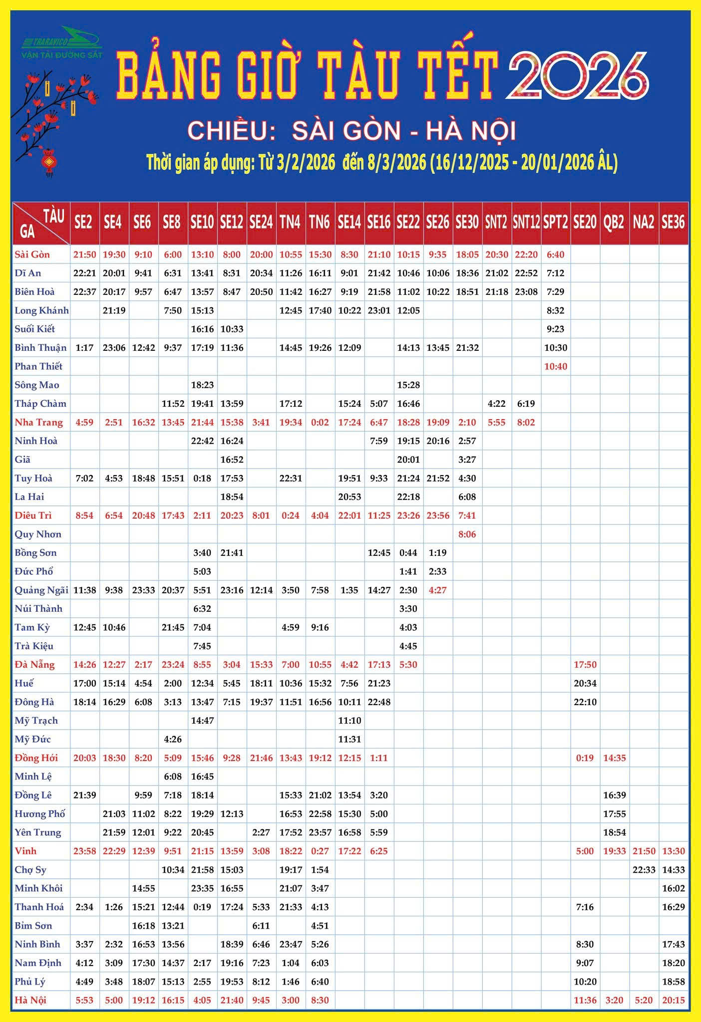 - Sài Gòn – Vinh và ngược lại: 02 đôi (SE13/SE14, SE15/SE16);